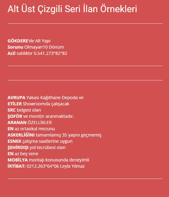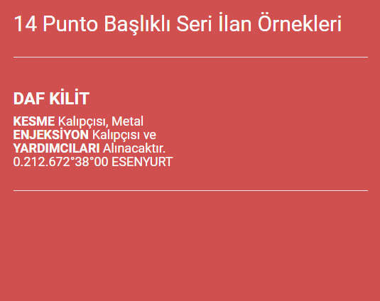 Sektörde en önde gelen Firmamız ile hizmetlerimizi her zaman sizin için iyileştirir ve sürekli kendimizi geliştirmekteyiz. En iyi ilan hizmetlerini daima sitemizde bulabilirsiniz. Hızlı bir şekildeHürriyet ilan servisi hizmetimizden yararlanabilir ve ilanlarınızı oluşturabilirsiniz. İmkanınız dahilinde zorlanmayacağınız ücretler ile ilanlarınızı verebilir ve popüler gazetelerde yayınlanmasını sağlarız.Hürriyet ilan verme işlemi haricinde diğer gazeteler olan Posta Milliyet, Sabah, Habertürk gibi birçok önemli gazetede seri ilan ticari ilan teşekkür veya başsağlığı ilanlarınızı yayınlamaktayız. Sitemiz üzerindeki ilan ver bölümüne girdikten sonra ilanınızı girebilirsiniz. İstediğiniz şekilde ilanınızı oluşturduktan sonra dilerseniz uzman ekiplerimiz yazı uyumu, anlatım bozukluğu veya çeşitli eklemelerle yazınızı düzenleyebilirler.